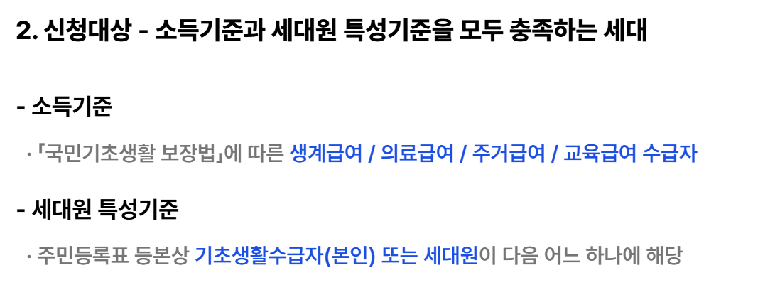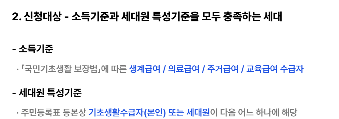 신청 대상은 주로 생계급여, 의료급여, 주거급여, 교육급여 수급자 중 특정 조건을 충족하는 가구이며, 신청은 주민센터 방문 또는 온라인을 통해 가능합니다.