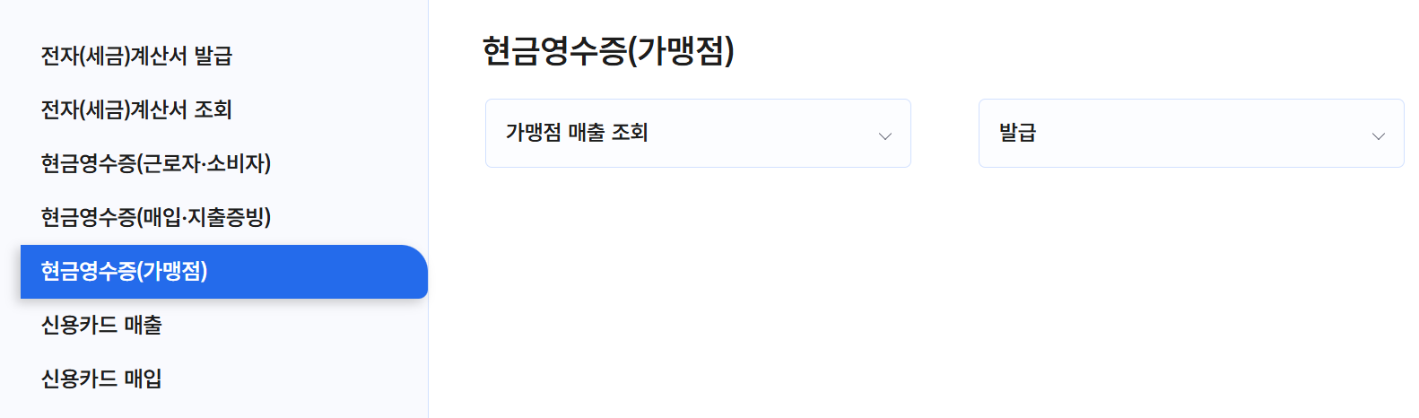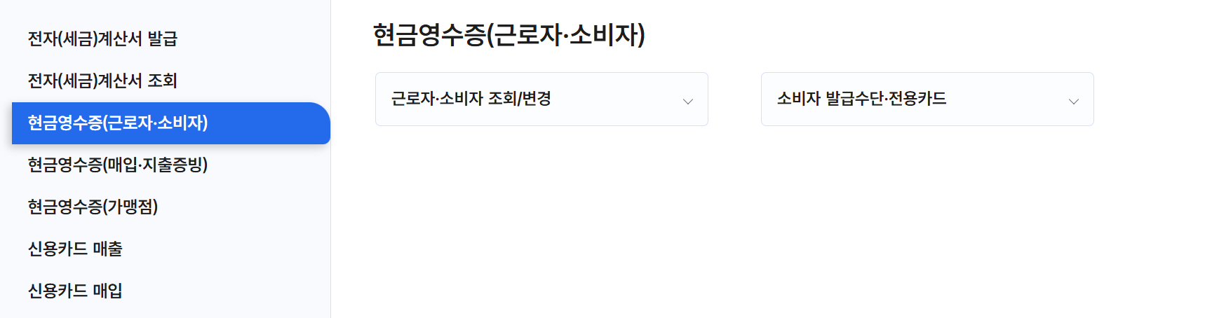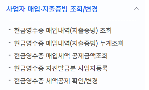 조회 방법: 메뉴에서 '현금영수증 조회'를 클릭합니다.