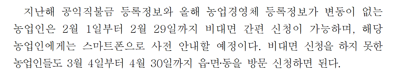 농업인들은 정해진 절차와 기한에 맞춰 신청을 완료하고, 제공되는 지원을 통해 경영 안정과 소득 증대의 기회를 가질 수 있습니다.