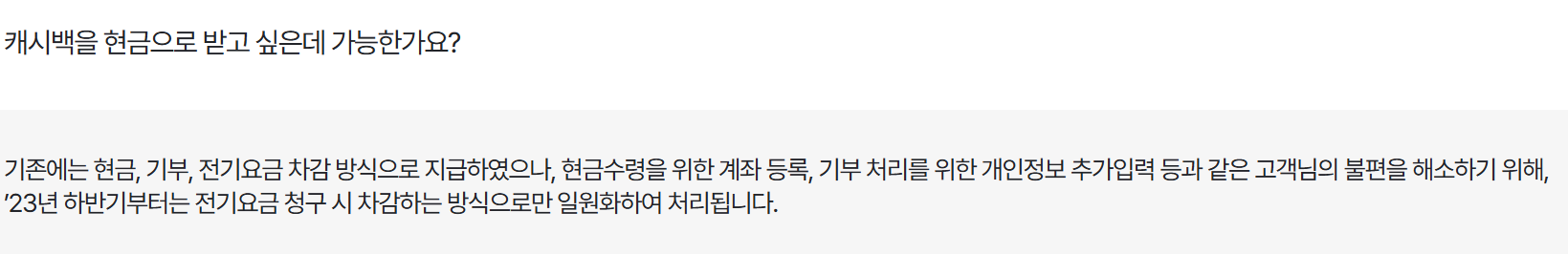 매월 산정된 캐시백은 다음 달 전기요금 청구 시 반영됩니다.