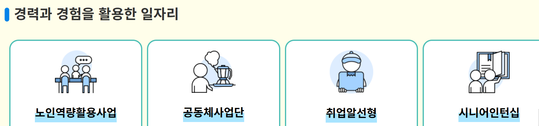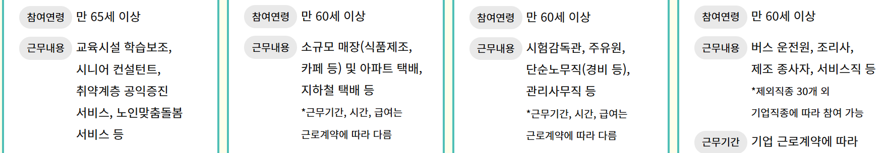 취업알선형: 시험감독관, 주유원, 경비 등 다양한 직종에서 활동할 수 있으며, 만 60세 이상 어르신이 참여하실 수 있습니다.