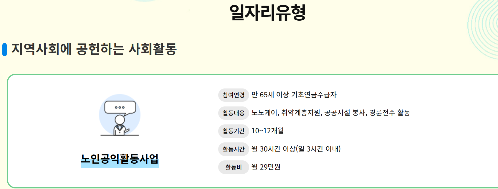 공익활동형: 지역 사회를 위한 봉사 활동으로, 만 65세 이상의 기초연금 수급자가 주로 참여합니다.