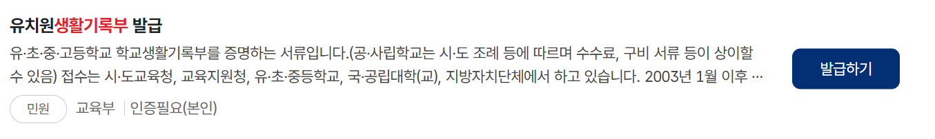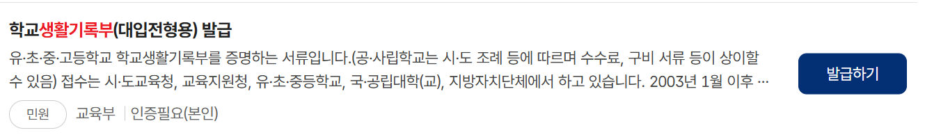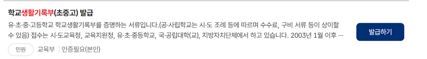 로그인 후, 검색창에 "생활기록부"를 입력하면 관련 서비스가 나타납니다. 보통 "초·중·고등학교 생활기록부 발급"이라는 이름으로 제공되며, 해당 서비스를 클릭하면 조회 및 발급을 진행할 수 있습니다.