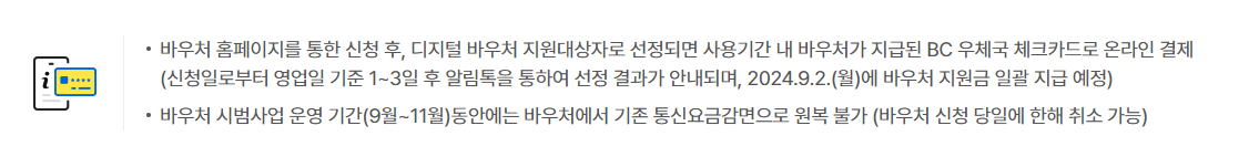 시범사업에 참여하는 기초생활수급자는 우체국 체크카드(BC카드)를 통해 디지털 바우처를 지급받습니다.